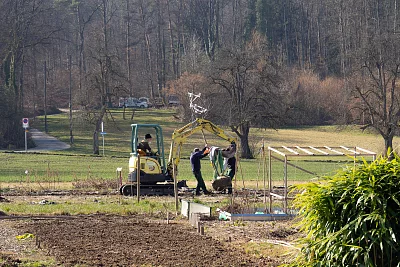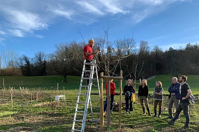 Wir wollen hoch hinaus! Darum pflegen und pflanzen wir Obstbäume und Sträucher auf dem Gartenareal. Das Ziel der Baum- und Strauchgruppe ist die stetige Weiterentwicklung des Areals Grüenhölzli zu einem biodiversen und vielseitigen Lebensraum, der Menschen, Tieren und Insekten gleichermassen Nahrung bieten kann. Die Pflanzung von Bäumen und Sträuchern ist dabei eine Schlüsselkomponente, mit der wir nicht nur eine landschaftliche Strukturierung, sondern mannigfaltige ökologische Vorteile wie Schattenwurf, die Kreierung von Nischen, Wasserrückhalt und vieles mehr erreichen. Nebst den Pflanzungen und deren langfristiger Pflege eigenen wir uns als Teil des Projekts altes, beziehungsweise neues Wissen an, ernten und verarbeiten zusammen die Früchte unserer Arbeit und planen für eine grüne Zukunft.